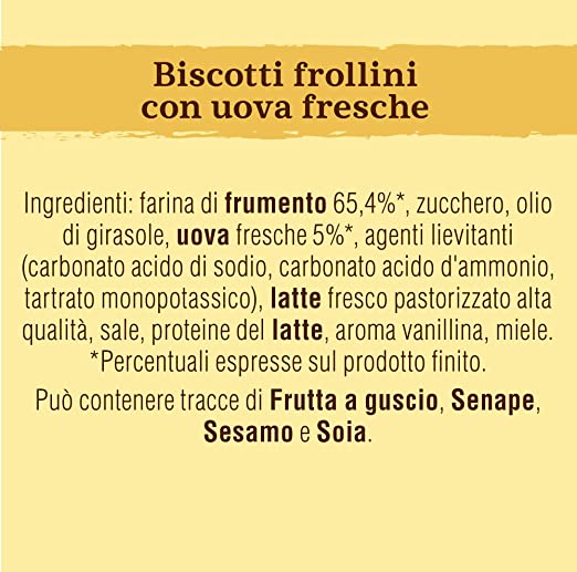 Harina de trigo 65,4%, azúcar, aceite de girasol, huevos frescos 5%, agentes leudantes (carbonato ácido de sodio, carbonato ácido de amonio, tartrato monopotásico), leche fresca pasteurizada de alta calidad, sal, proteínas de la leche, aroma de vainillina, miel. *Porcentajes expresados sobre el producto terminado. Puede contener trazas de frutos secos, mostaza, sésamo y soja.