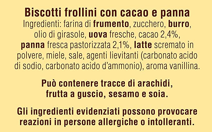Harina de trigo, azúcar, mantequilla, aceite de girasol, huevos frescos, cacao 2,4%, nata fresca pasteurizada 2,1%, leche desnatada en polvo, miel, sal, gasificantes (carbonato ácido de sodio, carbonato ácido de amonio), aroma de vainillina. carbonato ácido de amonio), aroma de vainillina. Puede contener trazas de frutos de cáscara, sésamo y soja.