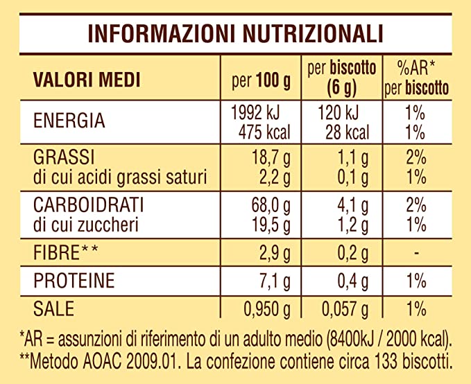 Valor medio por 100gr.Energía: 475 Kcal / 475kJ