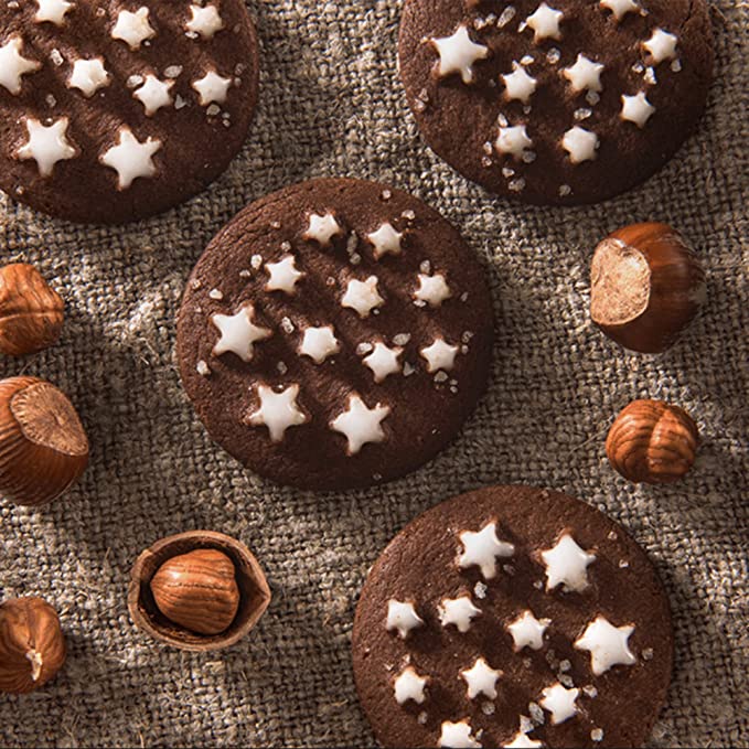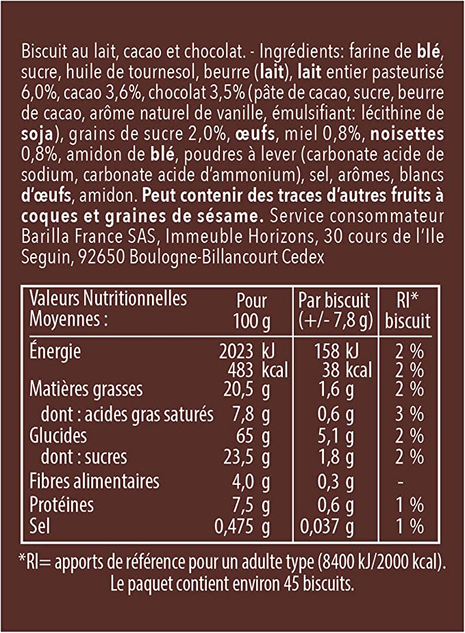 Galletas con leche, cacao y chocolate. - Ingredientes: harina de trigo, azúcar, aceite de girasol, mantequilla (leche), leche pasteurizada 6,0%, cacao 3,6%, chocolate 3,5% (masa de cacao, azúcar, manteca de cacao, aroma natural de vainilla, emulgente: lecitina de soja), granulado de azúcar 2,0 %, huevos, miel 0,8%, avellana 0,8%, almidón de trigo, gasificantes (carbonato ácido de sodio, carbonato ácido de amonio), sal, aromas, clara de huevo