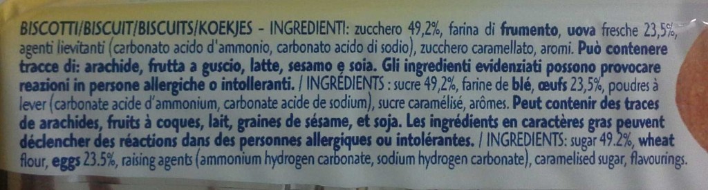 Azúcar 49,2%, harina de trigo, huevos frescos 23,5%, gasificantes (hidrogenocarbonato de amonio, hidrogenocarbonato de sodio), azúcar caramelizado, aromas.